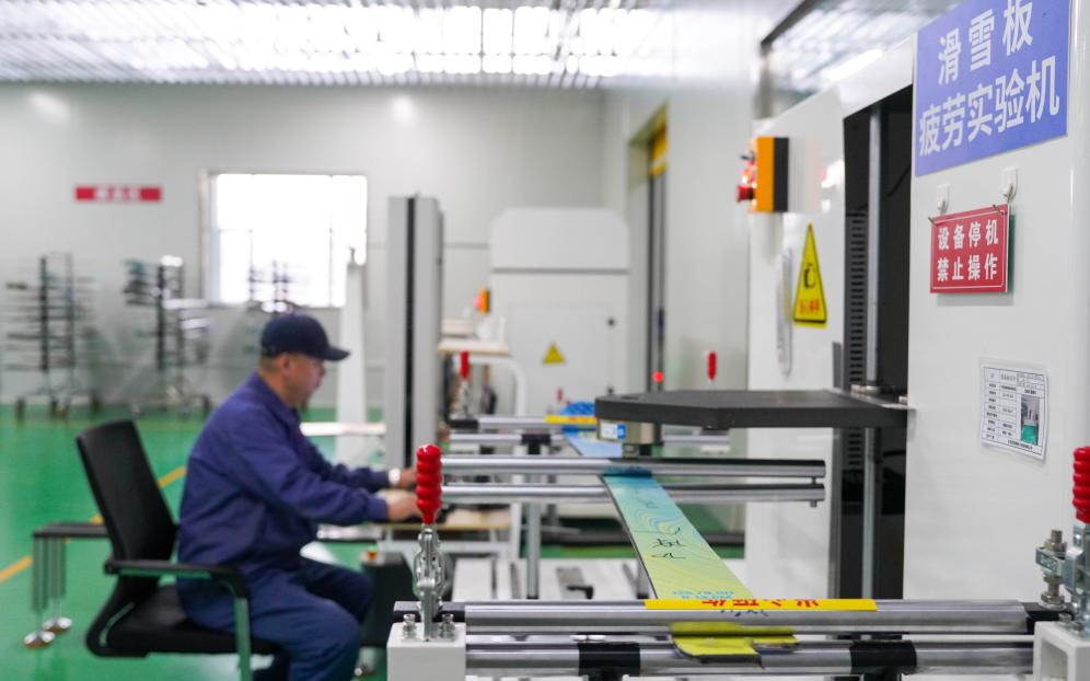 2025年12月4日,在吉林化纤国兴复合材料有限公司的车间内,工作人员用机器设备检测公司自主研发生产的碳纤维滑雪板。新华社记者 颜麟蕴 摄