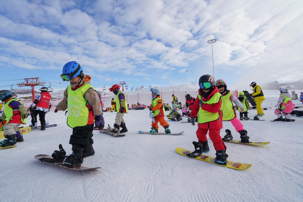 2025年12月1日,学生在阿勒泰将军山国际滑雪度假区练习单板滑雪。新华社记者 阿曼 摄